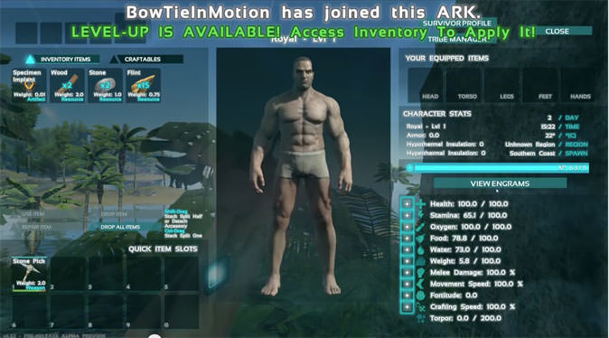 キャラクターのステータスの育成やEngramsで次のクラフトを習得する事ができます