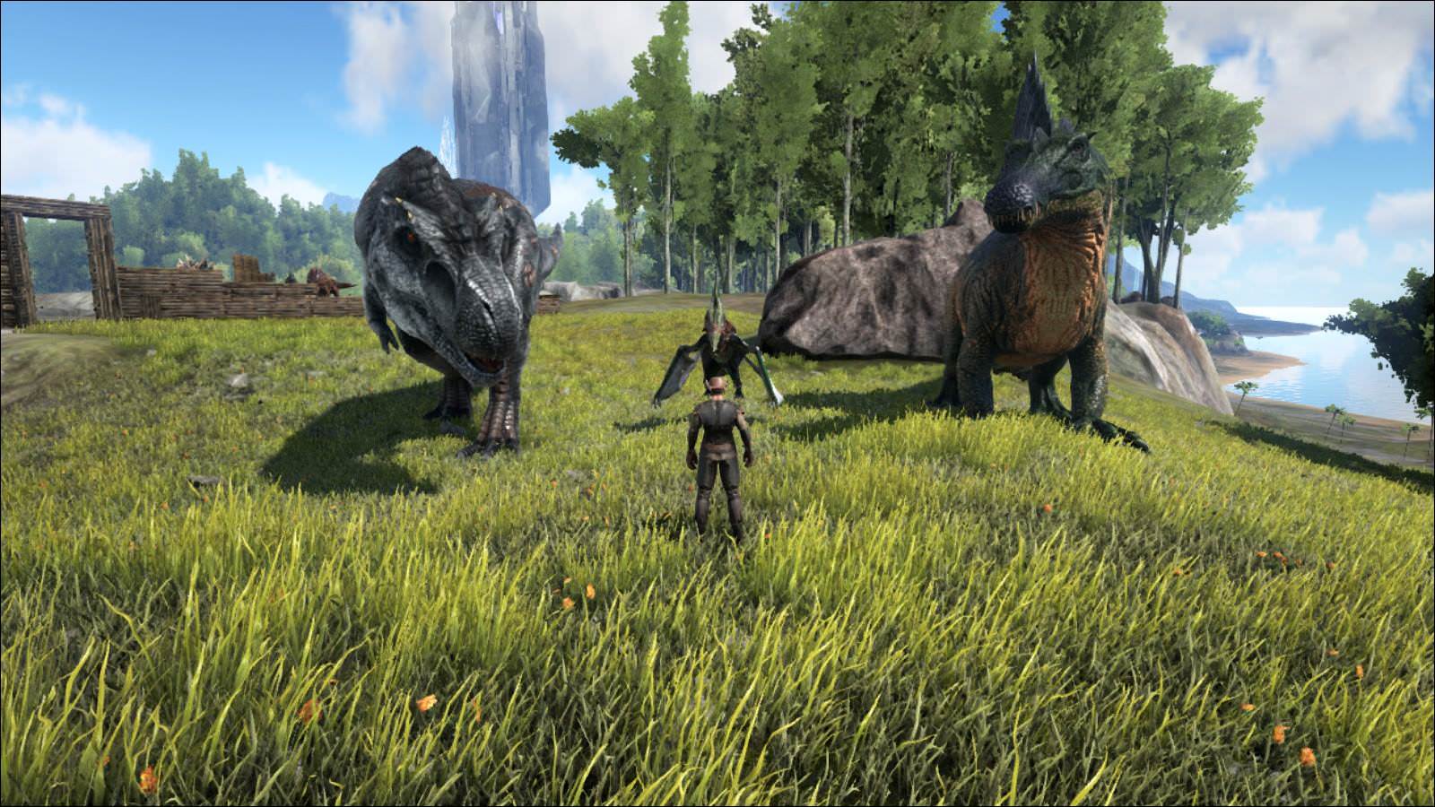島の探索、自分の基地の強化(作物を育てる、建築、恐竜テイム)