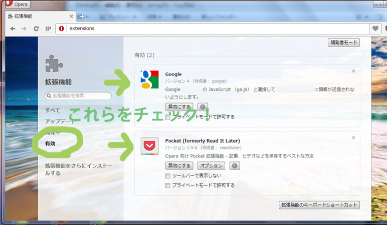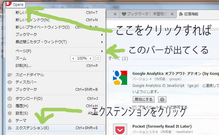 それではまずはOperaの アドオンをチェックしましょう。