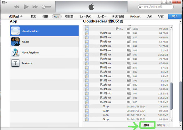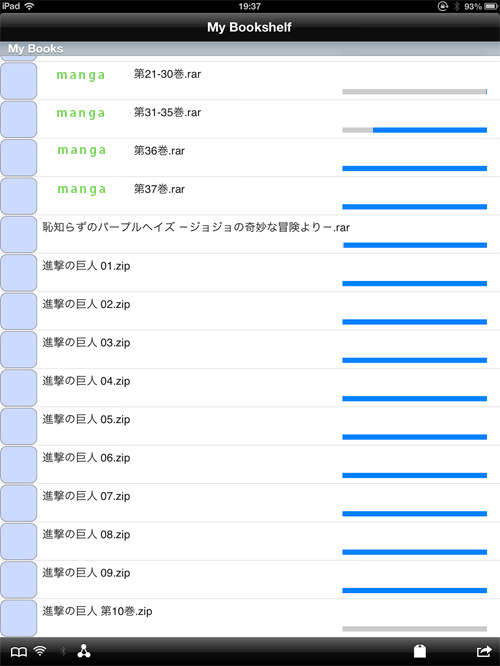 ここにPCから送りこんだZIPファイルやらRARファイルやらが並ぶわけです、削除するときはしたい本を選んで、左にスライドすればできます